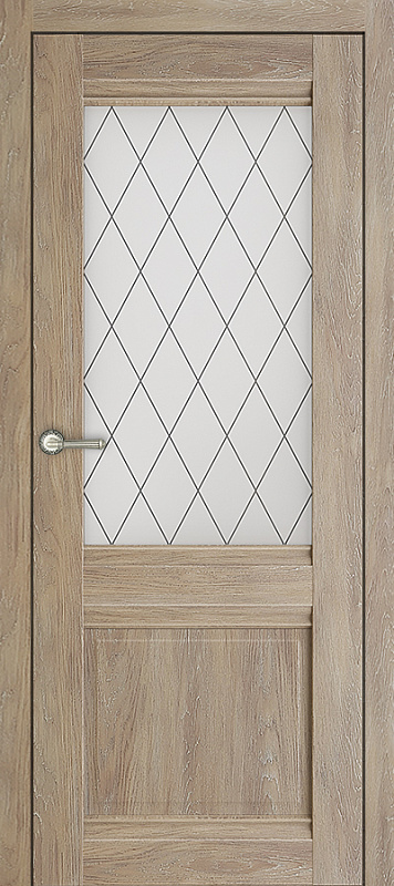 Царговые (сборные) двери изготавливаются в глухом и остекленном варианте в пленке с текстурой под натуральный шпон. В остекленной двери используется матовое стекло (сатинат) с витражным рисунком. Двери комплектуются телескопическим погонажом.