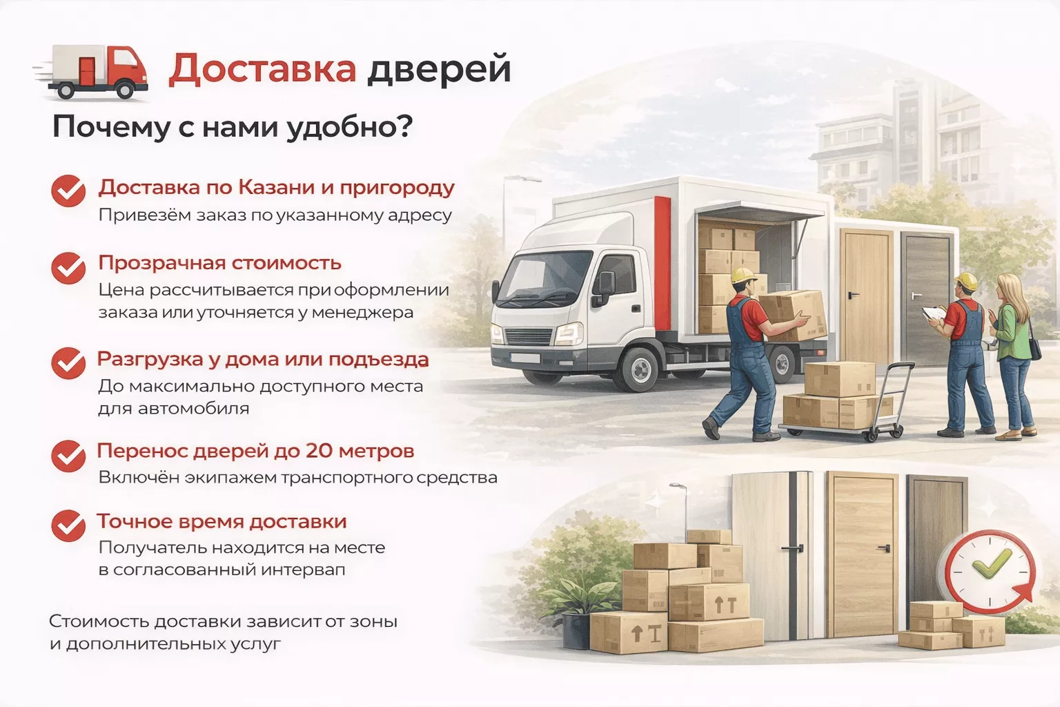 По запросу покупателя доставка осуществляется по указанному адресу в пределах города и пригородных районов. Разгрузка производится в максимально доступной точке - до места, куда может подъехать автомобиль. Перенос дверей выполняется экипажем транспортного средства и включает перемещение товара до подъезда или частного дома на расстояние не более 20 метров от места остановки машины.